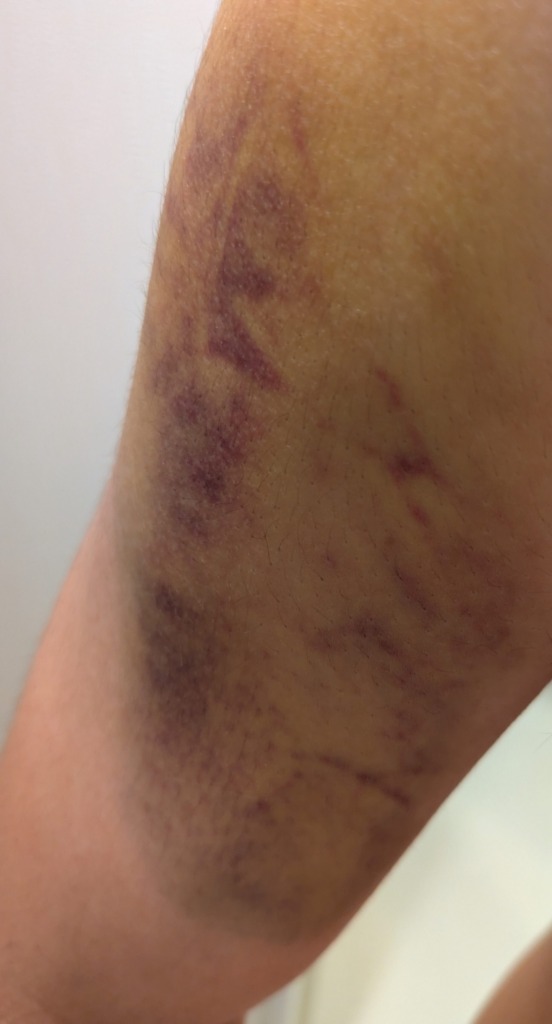 【閲覧注意】打球直撃して数日後のアザの様子。なぜか当たった場所の周りが変色している。(*)